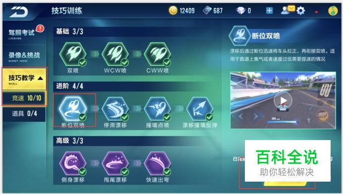 然后我们点击左侧的技巧教学按钮,来到技巧教学专区,然后点击断位双喷,点击开始训练