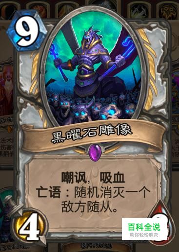 TOP2:黑曜石雕像 我认为这是一张橙卡,9费4/8的身材并且具有嘲讽和吸血,虽然身材一般,但是属性是随机消灭敌方一个随从,这也是让人最为头疼的。