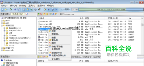 用软碟通工具打开下载好的win7旗舰版64位系统镜像,在打开的界面找到sources文件夹,鼠标双击展开,右侧找到boot.wim,用鼠标右键单击,提取到E盘根目录,用同样的方法把install.wim提取到E盘根目录。