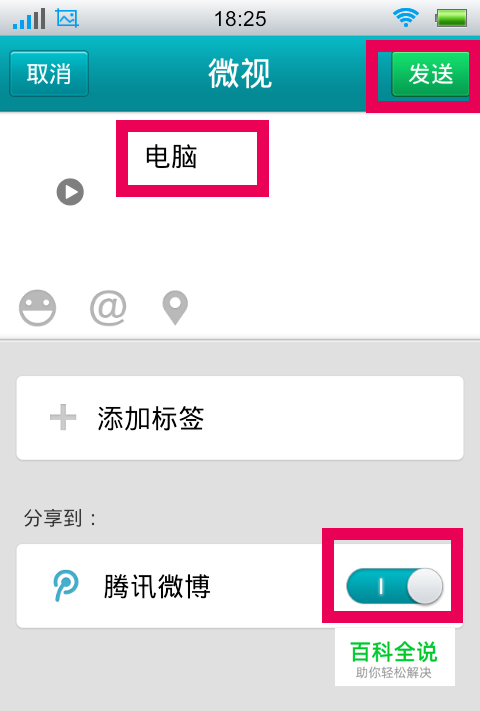 点击使用按钮之后进入到发送页面,输入最少两个字的心情,如果想要同时分享到微博的话酒吧腾讯微博右侧的开关打开,然后点击右上角的发送按钮,如图: