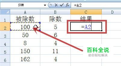 在“C2”单元格内选输入一个等号“=”,再点击被除数“100”(图中红色箭头所指)