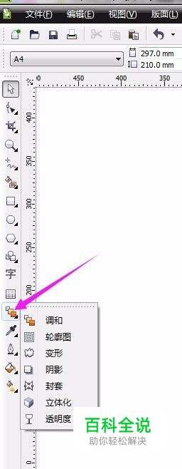 在左侧的工具栏中,找到“交互式调和工具”,点击右下角可以下拉出一些功能项,如图所示