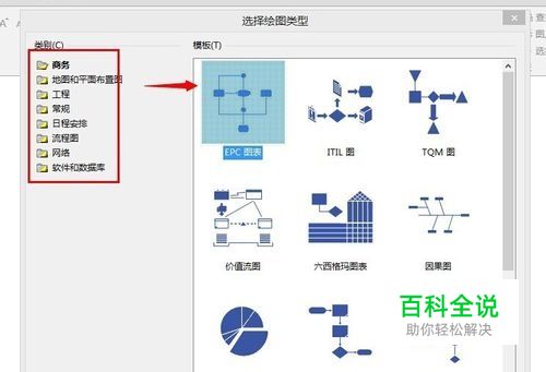 第一次打开Visio文档会出现以下窗口, 提示您可以创作哪种图表, 左侧为分类, 右侧区域为图形样例区域。