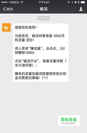公共号蜗流每天可以赚20M手机流量。点个四五天,移动流量套餐叠加包就不用花钱买了,免费就是幸福。