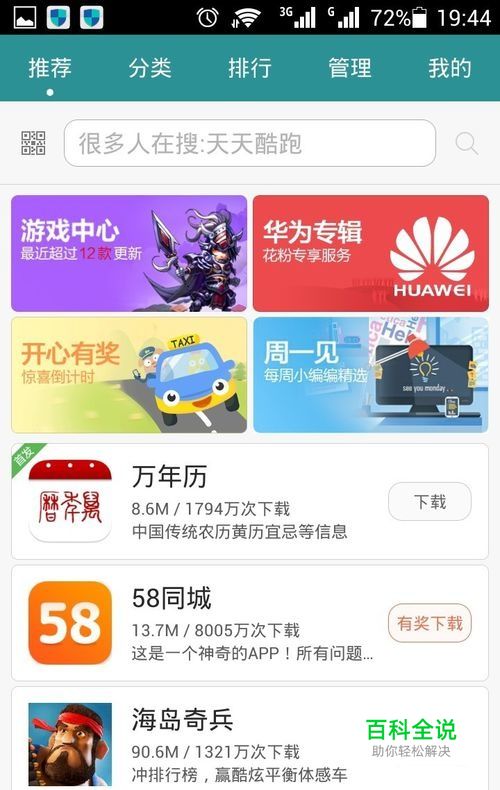 在华为应用市场首页的上方,有一行菜单栏,点击其中的“管理”选项,如图所示。