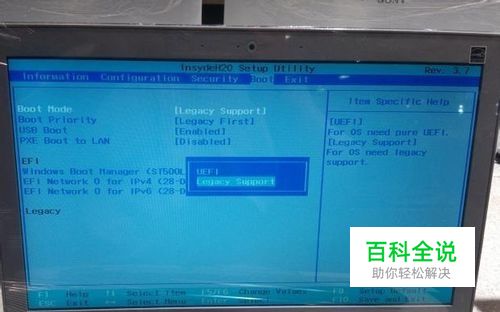 进入BIOS后,BIOS英文看不懂没关系!我们知道哪个英文是什么意思就成,对照到来,启动模式改成legacy support