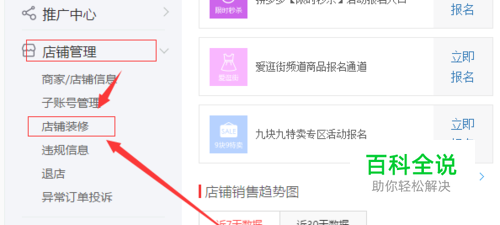 第二,在店铺首页的左侧栏目中找到 店铺管理 选项 子选项,店铺装修,进入店铺装修页面,如下图所示;