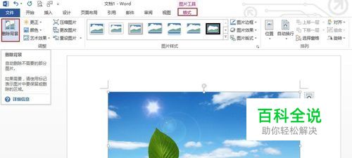 这时候单击图片,选中该图,上方会显示图片“格式”选项卡,然后单击“删除背景”。