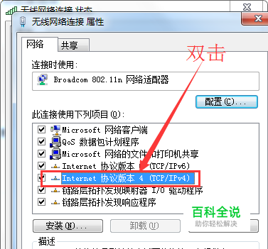 然后电脑会弹出【无线网络联=连接属性】对话框,在该对话框中双击选择【Internet协议版本4(TCP/IPv4)】,如图所示