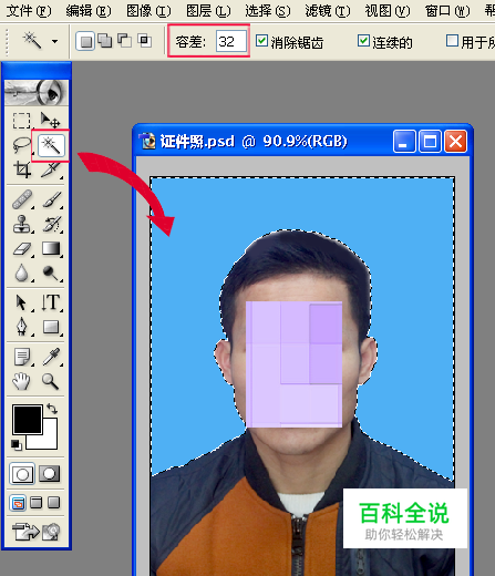 我们以一张蓝色背景颜色的证件照更换为红色背景颜色为例,首先点击左边工具栏面板中的“魔棒工具”