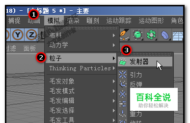 打开软件操作界面后,在菜单栏这里, 我们找到:模拟 再点击:模拟 弹出菜单就有:粒子,再点:发射器, 点击“发射器”即可创建“粒子发射器”对象。