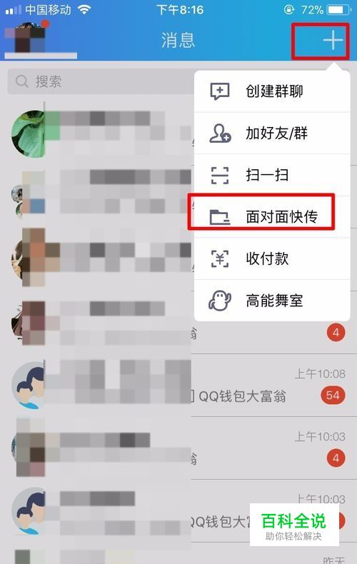 首先,我们需要给好友传送文件的时候,需要登录QQ账号之后,点击右上角的【+】号,在弹出窗口点击【面对面快传】的选项。如图所示