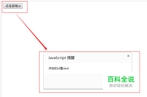 所有代码。把所有代码复制到新建的html保存后运行即可看到效果(注意:演示用的jquery.min.js是本地的文件,所以运行时需要注意检查jquery.min.js文件路径是否正确) 所有代码: <!DOCTYPE html> <html> <head> <meta charset="UTF-8"> <title>jq获取id</title> <script type="text/javascript" src="jquery-1.9.1.min.js"></script> <script type="text/javascript"> $(function(){ $("input").click(function(){ var id = $(this).attr("id"); //获取点击的id alert("点击的id是:"+id); }) }) </script> </head> <body> <input type="button" id="test" value="点击获取id"> </body> </html> 如图: