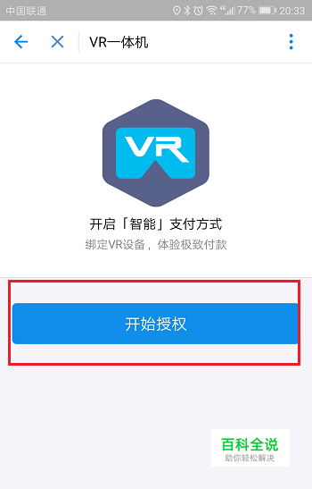 第六步进去VR设备界面之后,点击开始授权,可以通过VR设备进行付款,如下图所示: