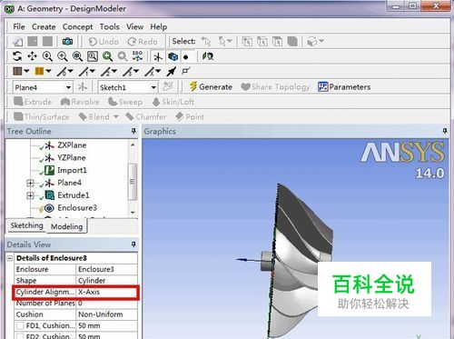 接上一篇《DesignModeler对叶轮模型处理(2/3)》,选择“X-Axis”为轴线进行包围,如图所示