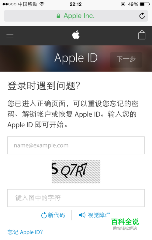 进入正确页面“输入您的Apple”并“键入图中的字符”,填完后点击“下一步”。
