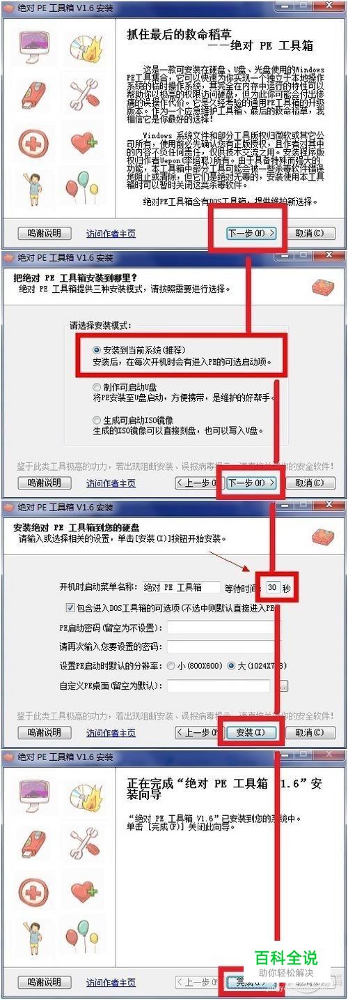 硬盘安装Win7系统教程第一步——安装绝对PE工具箱 为什么笔者要推荐这款PE工具箱(跟通用PE工具箱是同兄弟),是因为这个绝对PE工具箱可以在Windows7下直接安装到Win7系统里,支持跟Win7系统同步启动,就算Win7系统某日崩溃了完全进不去,还能通过这个绝对PE工具箱进入PE来拯救你还没来得及保存的数据和重装Win7系统。 因此,如果想防范于未然,可以在系统还没崩溃的时候,预先安装好这个绝对PE工具箱,那不借助任何硬件工具来重装Win7也不是什么难事! 软件名称: 通用PE工具箱(绝对PE的最新升级版) 软件版本: 3.3 官方正式版 软件大小: 93.65MB 软件授权: 免费 适用平台: Win9X Win2000 WinXP Win2003 Vista Win7 下载地址: http://dl.pconline.com.cn/download/54944.html 温馨提醒:据绝对PE工具箱的作者介绍,绝对PE已经被整合到通用PE工具箱。(绝对PE和通用PE的安装Win7方法几乎一样) 一键安装绝对PE到硬盘上方法很简单,在Win7或XP系统里,双击打开绝对PE工具箱这个软件(图1),然后点击“下一步”还是“下一步”,设定一下开机启动时间为30秒,点击“安装”,等待1分钟左右就可以准备重启电脑进入下一步! 注一:图1中的时间默认是3秒,笔者设定为30秒,是为了方便大家更容易进入PE(至于为什么这样说,有些东西只能自己亲身体会才能明白)。 注二:由于PE的权限极高,用户可以在PE里面为所欲为,如果不想其他人轻易进入你的PE,请加密!或者在想重装系统的时候才安装这个工具在Windows7里。 绝对(通用)PE的版本可能会随着软件的更新而有所变化,但大概的安装方法几乎不变。只要自己理解了每一步是干什么的,万变不离其宗,一通百通。 至于为什么选择安装Win7而不是XP,因为Win7已经是最主流的系统,而XP也因为已经10岁高龄开始不能满足大家的需求。Win7好不好用,用过就知道!至于为什么不介绍Ghost版的Win7安装方法,笔者只能说,只有原版正版的Win7系统才能让你用得安心。