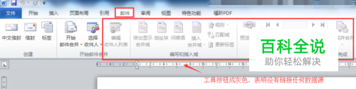 2、 打开文档后,“邮件”菜单下的工具按钮变成灰色了,表明现没有连接任何数据源,这时再保存一下即可。