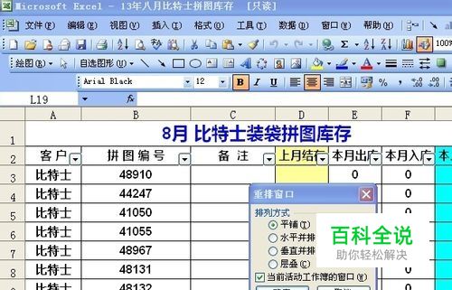 选择13年八月比特士拼图库存.xls 菜单栏的窗口菜单里面的重排窗口跳出以下窗口,2003版本的选择:视图--重排窗口。都找找点击后就会出现水平垂直排列,根据不同的方向选勾。