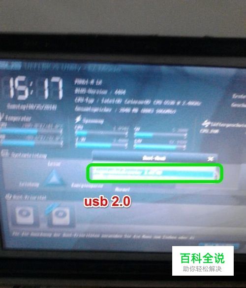 电脑开机后连续按[del]【台式电脑进入BIOS较常用的热键】,现在我所使用的是华硕主板。通过提示按F1进入界面。按键上下左右控制光圈所在位置并找到下方F8确定进入后,会出现三个选项,这时选择USB 2.0确定【部分电脑便成功以U盘启动了】