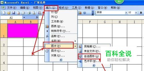 如下图,我们准备给加色的表格添加多条斜线。点击插 入--图片--自选图片。会弹出一个小的窗口。