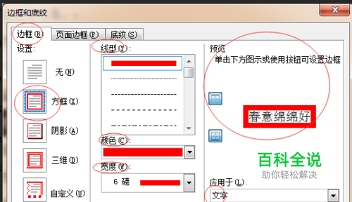 在弹出的“边框和底纹”里,在边框这里根据自己的需要设置,设置的结果可以在“预览”这里看到效果。