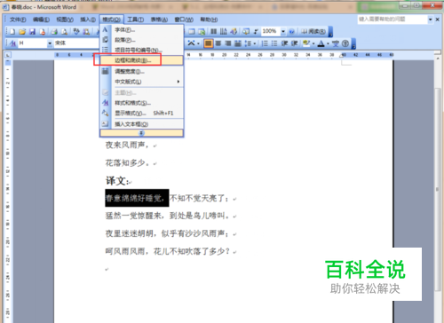 打开一个文档,选择要加边框和底纹的文字,选择“格式”里的“边框和底纹”。