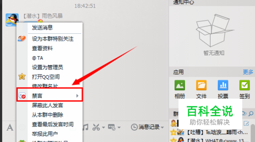 登录QQ打开QQ群,需要被禁言的群成员如果有发送消息在群中可以右键点击群成员头像,点击后你会发现列表中有个‘禁言’的功能。