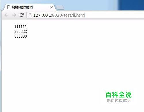页面所有代码,如有不明白可把所有代码复制到新建的html文件保存后运行即可看到效果。如图: 所有代码: <!DOCTYPE html> <html> <head> <meta charset="UTF-8"> <title>li去掉前面的圆</title> <style> li{ list-style: none; } </style> </head> <body> <ul> <li>111111</li> <li>222222</li> <li>333333</li> </ul> </body> </html>