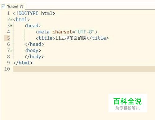 回到html代码页面,在<title>标签后面输入<style>标签,然后设置<li>标签的list-style:non。 如图: 代码: <style> li{ list-style: none; } </style>