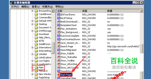 点击“确定”后,会弹出“注册表编辑器”界面,在打开的“注册表编辑器”左边的下拉列表中依次找到“ HKEY_LOCAL_MACHINE”——“Software”——“Microsoft”——“ Internet Explorer”——“Main”。如下图所示: 小提示:这里同第二步,可是不一样的哦,大家要注意了。