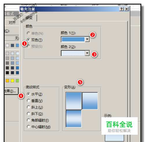 转到填充效果的对话框; 1;在“颜色”这里点“双色” 2;“颜色1”这里,点下小三角,弹出的颜色面板中选择蓝色; 3;“颜色2”这里,点下小三角,弹出的颜色面板中选择淡蓝色; 4;“底纹样式”这里,点其中一种渐变样式; 5;“变形”这里点其中一种变形 6;最后,点击确定。