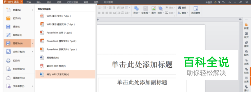 我们点击WPS演示,选择另存为下面的转换为WPS文字格式,这时会出现转为WPS文字文档的对话框。