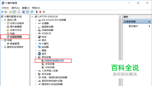 通过步骤一打开计算机管理界面,在界面找到“设备管理器”,单击选中,在右侧中的“其他设备”中找到“DataTraveler2.0”,如下图所示