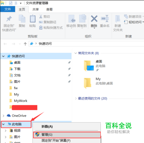打开文件资源管理器,快捷键是Window+E,在左侧选择“此电脑”,单击鼠标右键,点击“管理”,如下图所示