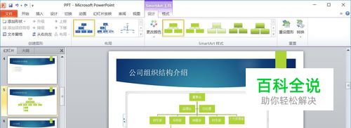 要求:为幻灯片5中,添加SmartArt图形,布局为“组织结构图”,将文本“监理会”和“总经理”的级别调整为“助理,在采购部下方添加“北区”和“南区”两个形状,分支布局为“标准”