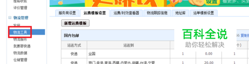 在店铺后台管理页面的左侧,找到“物流管理”-“物流工具”。右侧会弹出一系列的选项卡,点击“运费模块设计”,选中“新增运费模板”。
