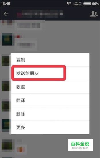 打开微信,打开和某个好友的聊天界面,或某个群的聊天界面,长按你想转发的一条记录,如图,弹出一个窗口,如果你就是转发这一条记录,那直接按‘发送给朋友’就行了。