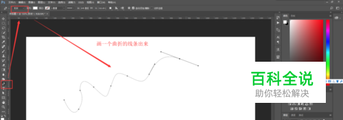 打开PS文件,新建一个图层,选择钢笔工具,选择绘制形状,然后用钢笔工具在画布中绘制一个弯曲的曲线出来,这个大家随意画,不同曲线最终的彩带效果也不一样。