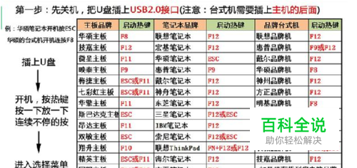 关机,插入【系统U盘】,重新启动后连续敲打热键。