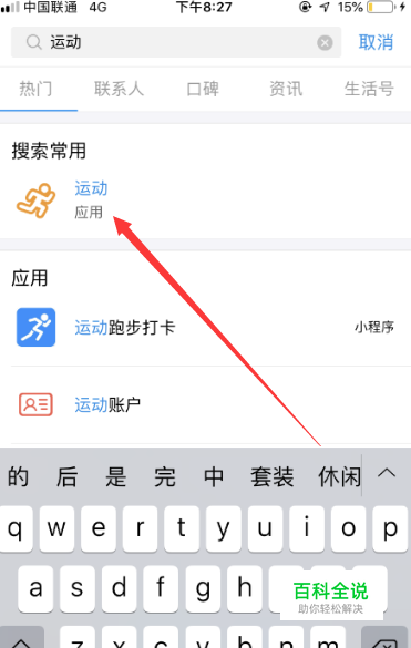 在首页页面,点击搜索框如下图所示,输入"运动"找到运动应用进入。