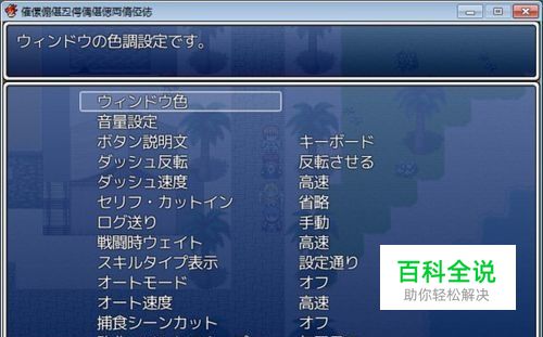 然后用方向键选择,回车键确认。非常推荐游戏开始后先设置系统选项。从上至下分别为:窗口颜色音量设定操作按键说明格式(键盘或手柄),推荐设置为键盘(如上图)移动切换反转(决定平常的移动方式,按住Shift切换成另一种行动方式。默认是不反转,平常是走,按下shift是跑。反转就是平常是跑,按住Shift是走。)为节省跑路事件,推荐设置为反转,如上图。移动速度(正常、高速、最速)最速非常快,但难以控制。个人推荐跑路时用高速,进行精细操作如搜刮时用正常。战斗台词(显示或省略)省略会加快战斗速度,个人推荐练级刷级时省略,在进行重大剧情战时打开。信息推进方式(手动或自动)自动会自动进行对话,手动则需要按键继续对话。平常手动即可,因为有热键可以迅速跳过对话。战斗信息速度(普通、高速、最速)根据个人需要调整速度,需要刷级就加快,看不清伤害和效果就调慢。技能种类表示自动模式(开、关)没什么大用自动速度(基本、低速、高速)同上捕食场景(开、关)败北凌辱场景(每次都看、已看过的省略、每次选择)初始化离开