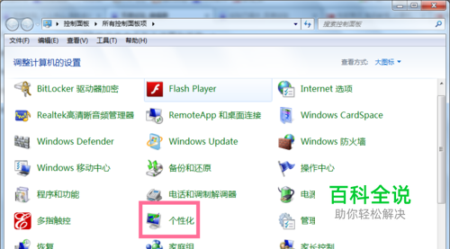在电脑的控制面板界面进入《个性化》设置,在个性化设置界面点击《声音》。