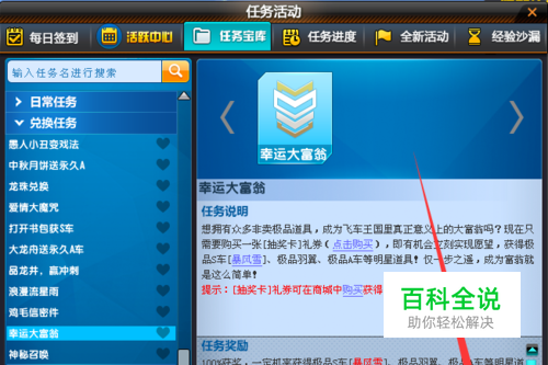 打开了任务中心以后,然后我们点击--任务宝库--之后我们再点击--幸运大富翁---如下图所示,这样我们就打开了-幸运大富翁-的道具开启页面。