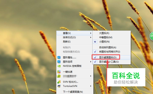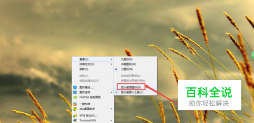 情况一: 在电脑开机之后,桌面上没有图标,然后鼠标右击,在出现的菜单中将鼠标放在 查看 选项上面,在出现的子菜单中点击 显示桌面图标,这样桌面的图标应该就会显示出来了。