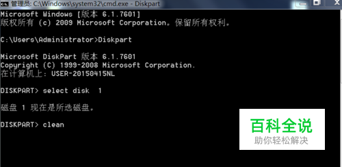 在运行窗口,输入cmd,回车,出现Dos运行环境,输入Diskpart,回车,弹出另一个命令窗口,然后将在上面(1)中的索引,输入select disk 1 进去,回车,输入clean,之后即可将空间内容清除;