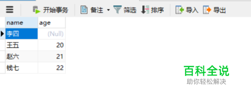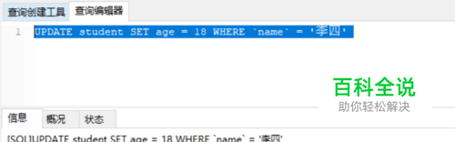 修改李四的姓名年龄,修改前为第3步中的图片 UPDATE student SET `name` = '李四2', age = 100WHERE `name` = '李四'