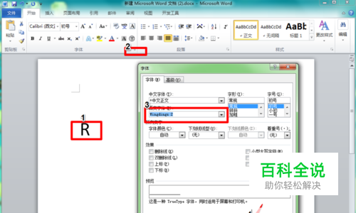 创建一个word文档 在编辑区域编辑一个 大写的字母R并选中点击开始选项卡中字体 右下角符号会弹出一个框 在西文那里选择字体为 wingdings2(倒数第二位) 如图
