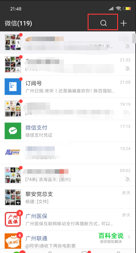 打开手机微信app,在主界面中,点击右上角的放大镜图标,进入搜索操作,如图所示