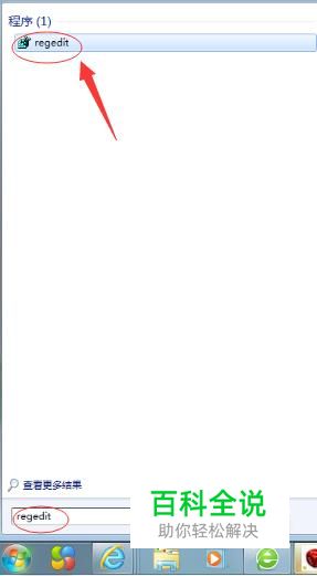 点击屏幕左下角,在输入框中输入“regedit”,并回车。